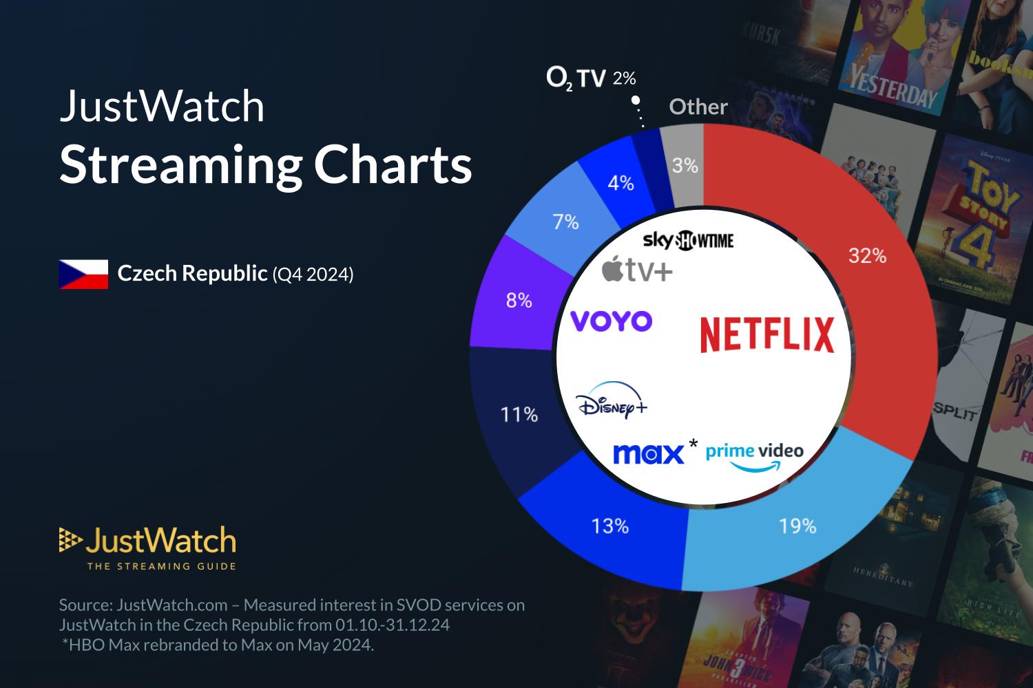 V JustWatch při tvorbě popularity tuzemských video streamovacích platforem jako obvykle vycházeli z toho, jak si 350 tisíc uživatelů služby v České republice vybralo své populární streamovací služby, rozkliklo nabídky streamování a označilo tituly jako zhlédnuté. Netflix S 32 % vede, i když za rok ztratil 3 %. Druhé je Prime Video s 19% podílem, kdy si naopak o dvě procenta, stejně jako voyo a Apple TV+, polepšilo. Max je s 13 % třetí. Nejlépe si ale do jisté míry vedlo Disney+, protože za rok vydělalo 4 % podílu.