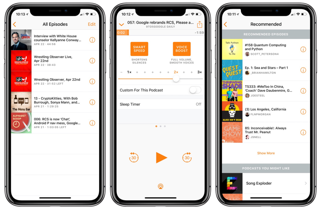 Overcast je výkonný a zároveň jednoduchý přehrávač podcastů s funkcemi Smart Speed, Voice Boost, a možností tvorby chytrých playlistů. Umožňuje stahování podcastů pro offline poslech, pokročilé vyhledávání, doporučení i objevování nových podcastů, nabízí podporu 3D Touch a CarPlay.