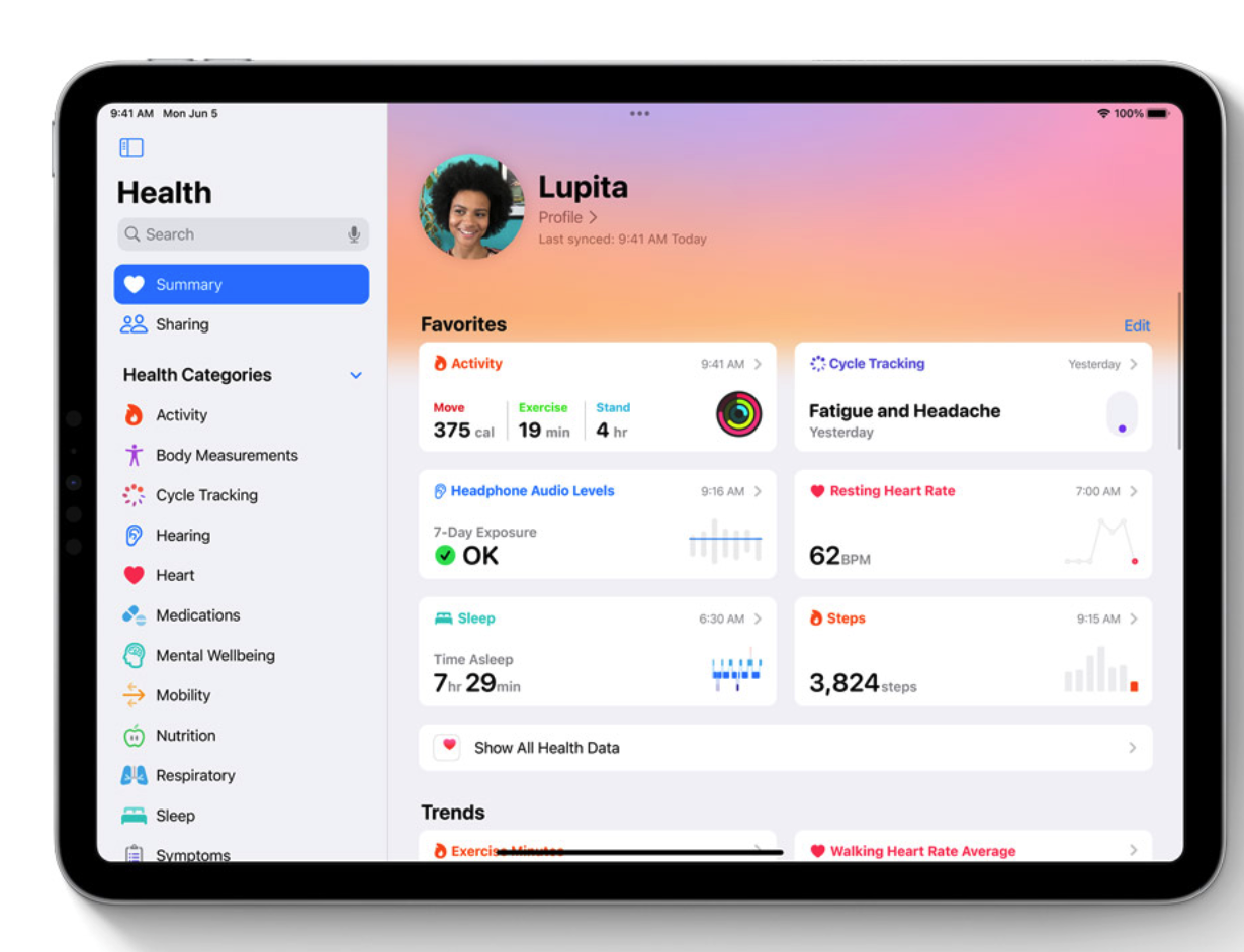 Majitelé iPadů s operačním systémem iPadOS 17 budou mít nově k dispozici také nativní aplikaci Zdraví. Aplikace Zdraví bude na iPadu k dispozici v designu optimalizovaném pro větší displej. V oblíbených položkách si můžete zobrazit podrobné informace, prohlížet trendy a zajímavosti a používat interaktivní grafy. Přímo ze zařízení iPad můžete vytvářet upomínky na léky, sledovat menstruační cyklus a zaznamenávat příznaky.