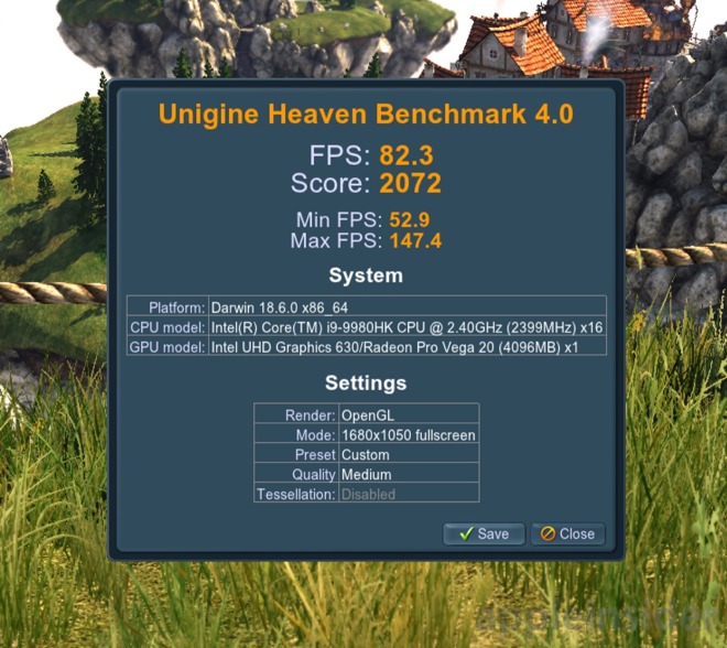 Co se týče kombinovaného výkonu procesoru a dedikované grafické karty, k jeho změření posloužil Unigine Heaven, který je zaměřený spíše na zhodnocení herního výkonu stroje. Nový model se s testem popral s průměrnou hodnotou 82,3 fps a skóre 2 072 bodů. Maximální úroveň fps se vyšvihla na 147,4 fps při středním nastavení kvality a vypnuté teselaci, stereo 3D zobrazení a AA. Loňská konfigurace s procesorem i9 a Radeonem Pro 560X byla schopna testem projít s průměrnou hodnotou 62,5 fps a celkovým počtem bodů 1 575. Zde je tedy výkonnostní nárůst o 25%.