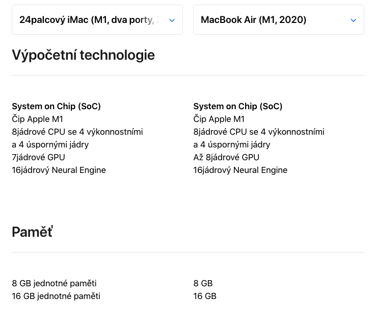 Oba stroje nabízejí čip Apple M1, 8jádrové CPU se 4 výkonnostními a 4 úspornými jádry a 16jádrový Neural Engine. Oba mají v základní konfiguraci i 7jádrové GPU. Paměť je u obou volitelná ve velikostech 8 a 16 GB. Úložiště startuje na 256 GB SSD, u MacBooku můžete chtít až 2 TB SSD, iMac dosáhne jen na 1 TB SSD. Jedná se ale o příplatkové konfigurace, které mají razantní vliv na cenu a které tedy neberme v potaz. Hodnotit není co, oba počítače jsou výkonem totožné.