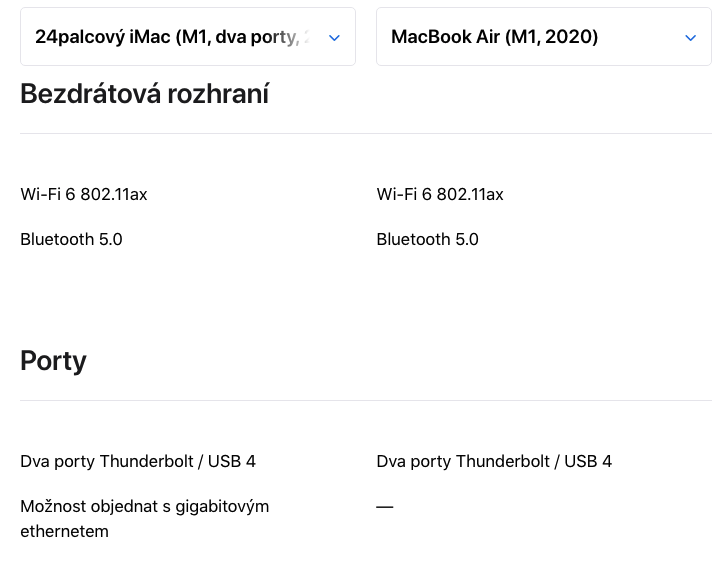 Oba mají Wi‑Fi 6 802.11ax, oba mají Bluetooth 5.0, oba mají dva porty Thunderbolt/USB 4. V balení iMacu dostanete Magic Keyboard a Magic Mouse nebo Magic Trackpad (za příplatek). Klávesnice MacBooku Air vede tím, že je podsvícená, čímž se malé bezvýznamné plus z předchozího bodu hrající pro iMac smazává. V případě kancelářské pracovní stanice ale potřebujete periférie externí. Když si tedy budete chtít k MacBooku Air dokoupit Magic Keyboard, připlatíte si 2 990 Kč, za Magic Mouse zaplatíte 2 290 Kč.