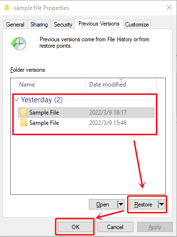 Krok 2: V novém vyskakovacím okně se vám zobrazí všechny verze složky, které lze obnovit. Vyberte tedy vhodnou verzi
