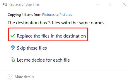 Krok 6: Klepněte na možnost pro nahrazení souborů v dané destinaci, abyste získali smazané fotky zpět