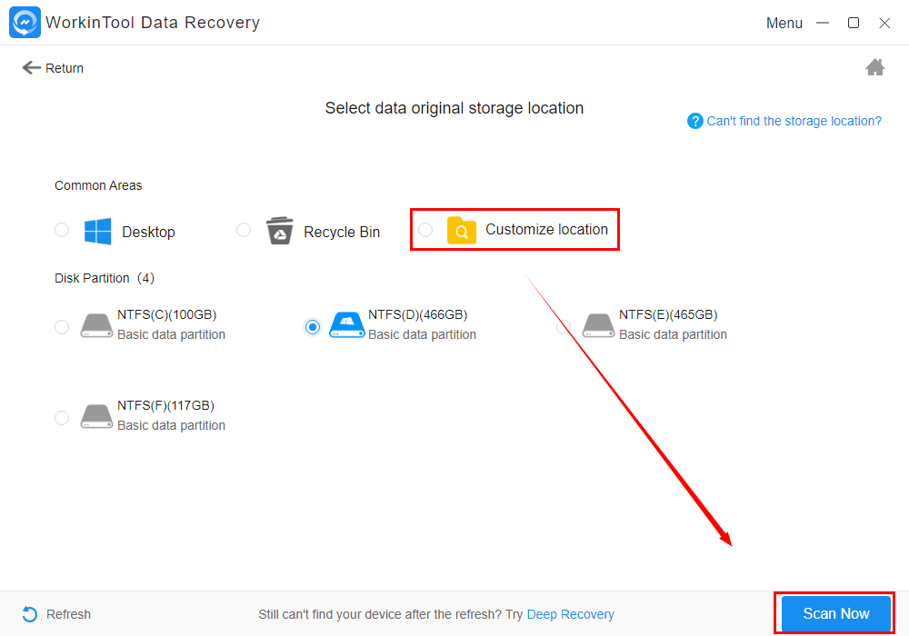 Krok 2: Vyberte lokaci pro obnovu ztracených fotografií a posléze klepněte na tlačítko Scan Now.