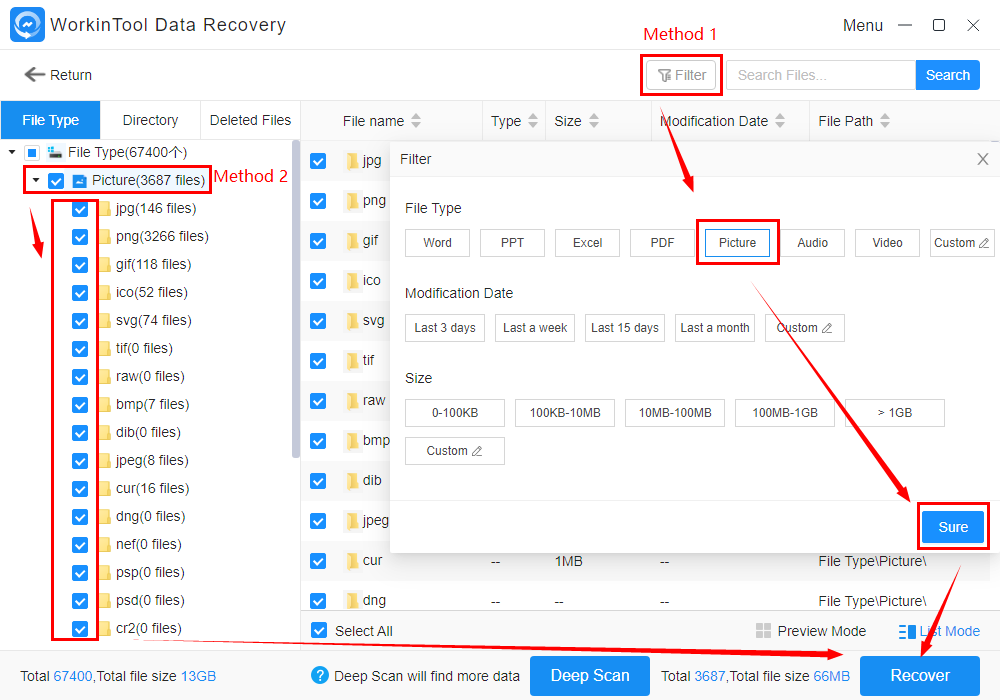 - Buďto označte možnost Picture, vyberte veškeré formáty a posléze volbu potvrďte tlačítkem Recover.