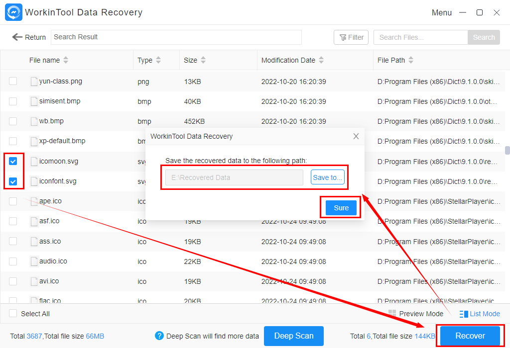 Krok 4: Vyberte všechny fotky, jaké chcete obnovit, nastavte cestu pro uložení a volbu potvrďte přes Sure > Recover.