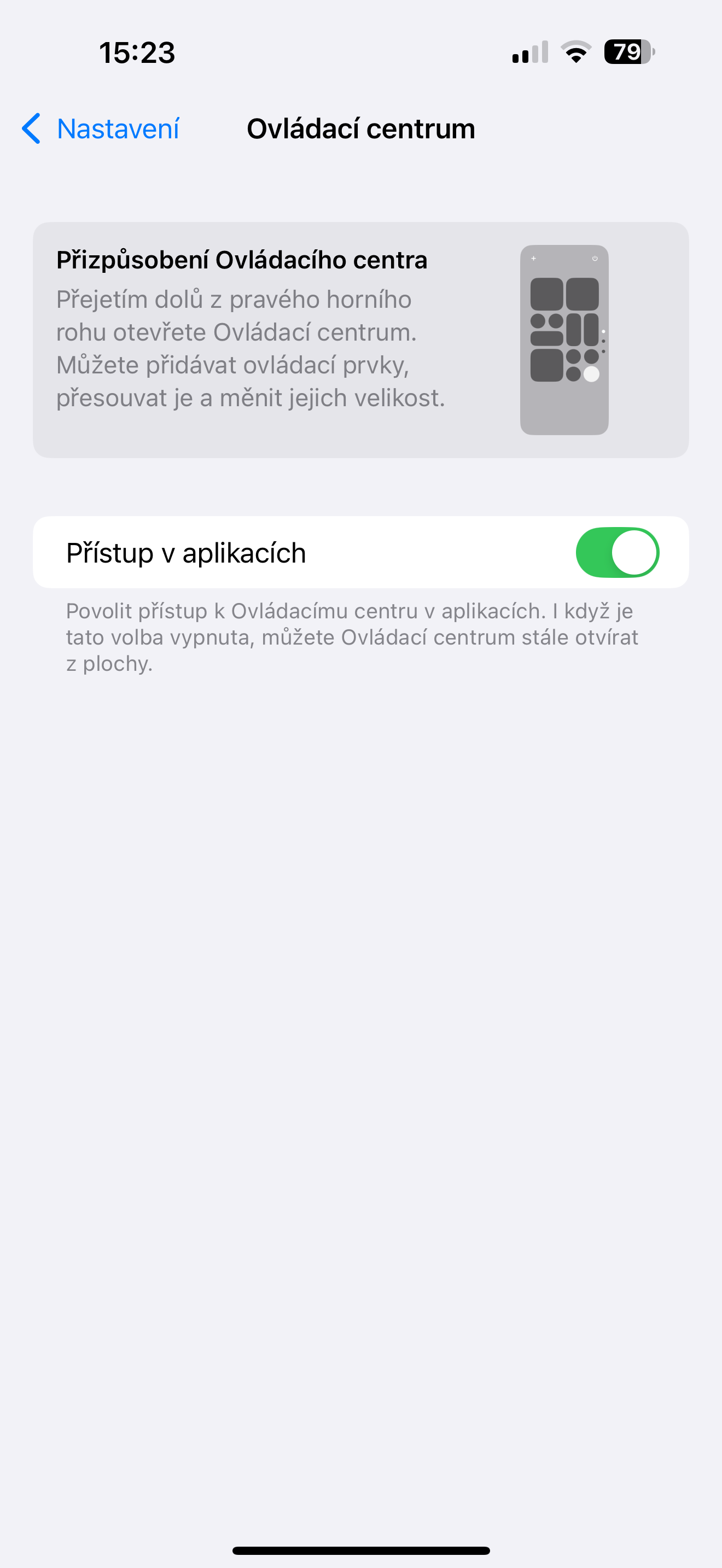 Je užitečné, pokud jej potřebujete, může ale otravovat, pokud jej otevíráte, aniž byste chtěli – třeba jiných aplikacích a hrách. Nebo to naopak chcete? Je to jen na vás. V Nastavení -> Ovládací centrum si k němu můžete zapnout nebo zakázat přístup v aplikacích. Toto nastavení bohužel přímo v redesignovaném Ovládacím centru iOS 18 nenajdete.
