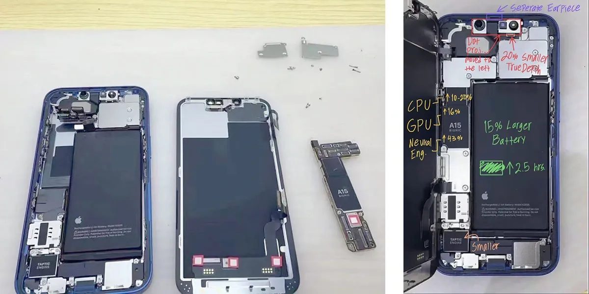 Na sociální síti Twitter se objevily první fotografie „vnitřností“ iPhonu 13, které na první pohled ukazují pět zásadních změn, kterých oproti předchozí generaci novinka doznala. První, a samozřejmě také nejzjevnější, je o 15 % větší baterie, kterou disponuje základní iPhone 13. Kapacity baterií a jejich velikosti se však mezi jednotlivými třináctkovými modely liší. Standardní iPhone 12 měl 10,78W baterii, kdežto novinka má 12,41 W. To, a různé softwarové úpravy, jí má zaručit o 2,5 hodiny delší výdrž.