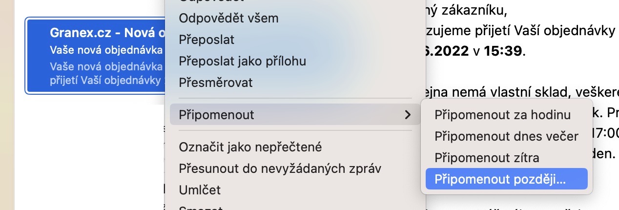 Kromě toho, že nově můžete v nativní aplikaci Mail plánovat odeslání jednotlivých e-mailů, tak si můžete také nastavit připomínky. To znamená, že pokud zrovna otevřete e-mail, na který nemáte čas, tak se díky této funkci na něj můžete nechat znovu upozornit, a to za určenou dobu. Díky tomu budete mít jistotu toho, že na e-mail nezapomenete, jelikož se bude jevit jako přečtený. Připomínku e-mailu můžete nastavit tak, že na něj klepnete pravým tlačítkem, a poté z menu vyberete Připomenout. Následně už si jen stačí zvolit, kdy vám aplikace má tento e-mail znova připomenout.