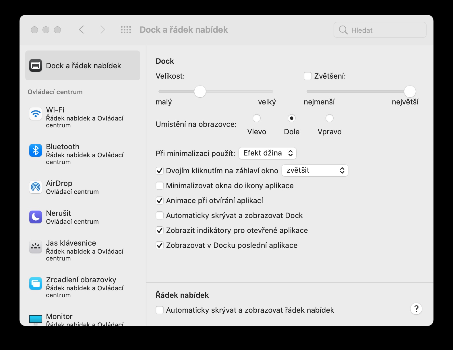 Dock se na Macu ve výchozím nastavení nachází ve spodní části obrazovky a má předem danou velikost, která většině uživatelů naprosto vyhovuje. Pokud byste ale chtěli parametry Docku na vašem Macu přece jenom změnit, klikněte v levém horním rohu na menu -> Předvolby systému -> Dock a řádek nabídek. Zde můžete upravit velikost a umístění Docku i jednotlivé efekty při spouštění aplikací.