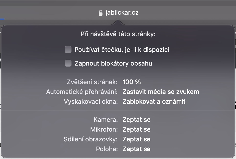 Je obecně známo, že Apple vyvíjí velkou snahu pro zajištění soukromí svých uživatelů, a ne jinak tomu je i v prohlížeči Safari. Aby určité webové stránky získaly přístup k mikrofonu, kameře, poloze, mohly na pozadí přehrávat zvuk nebo zobrazovat vyskakovací okna, musíte vše v prohlížeči nejprve povolit. Pro nastavení potřebných parametrů otevřete stránku, pro kterou chcete nastavení změnit, a poté klepněte na tučnou záložku Safari -> Nastavení pro tuto webovou stránku. Na tomto místě se přizpůsobení meze téměř nekladou, proto by pro vás nemělo být používání konkrétního webu nikterak limitující.
