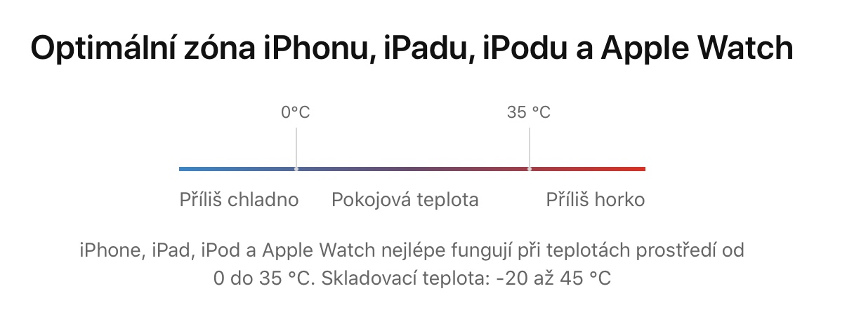 Chcete-li maximalizovat kondici baterie iPhonu, tak první základní věcí je, abyste jej využívali v optimální teplotní zóně. Ta je konkrétně u iPhonu, iPadu, iPodu a Apple Watch v rozmezí od 0 do 35 °C. I mimo tuto teplotní zónu vám zcela jistě zařízení bude fungovat, mohou se ale objevit různé problémy, společně s rychlejším poklesem kondice baterie. Vyhněte se tedy nabíjení iPhonu na přímém slunci a při vysoké zátěži (například hraní her), a pokud nabíjíte telefon přes noc v posteli, za žádných okolností jej nevkládejte pod polštář. Zároveň byste neměli využívat bůhvíjak hrubé obaly, aby se iPhone zvládal chladit, a to hlavně při nabíjení.