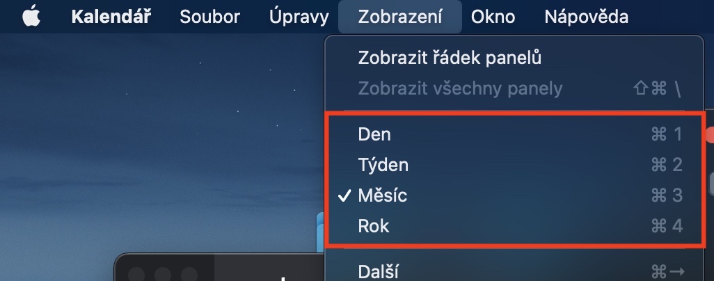 Stejně jako na iPhonu a iPadu, i v případě macOS si můžete přepínat zobrazení dne, týdne, měsíce či roku. To provedete po otevření Kalendáře přesunutím na Zobrazení v horní liště a přepnutím zobrazení pro den, týden, měsíc nebo rok, nebo stisknutím klávesové zkratky Command + horní řada kláves bez Shiftu, kdy číslem 1 přepnete na den, 2 na týden, 3 na měsíc a 4 na rok. Dále si v možnostech zobrazení můžete přizpůsobit velikost kalendáře či nastavit zobrazování různých událostí.