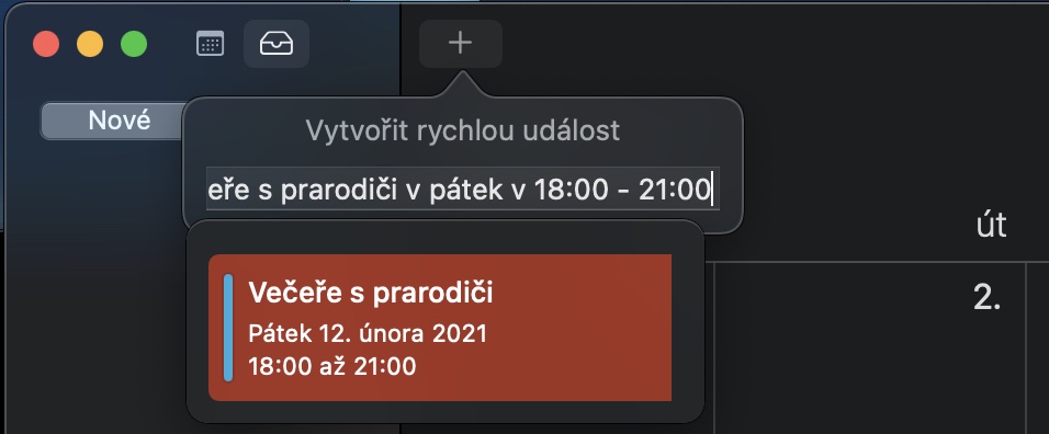 Mnoho uživatelů si nedokáže zvyknout na používání kalendáře. Ani ne proto, že by pro ně byl nepřehledný, ale spíše kvůli poměrně zdlouhavému nastavování času, data a dalších podrobností. V macOS kalendáři je však možné události zadávat pouze z klávesnice. Po otevření aplikace Kalendář klepněte na symbol +, případně stiskněte klávesovou zkratku Command + N, a do pole pro vytvoření události zadejte údaje. Zapisování je jednoduché, stačí napsat text ve stylu Večeře s prarodiči v pátek v 18:00 – 21:00.