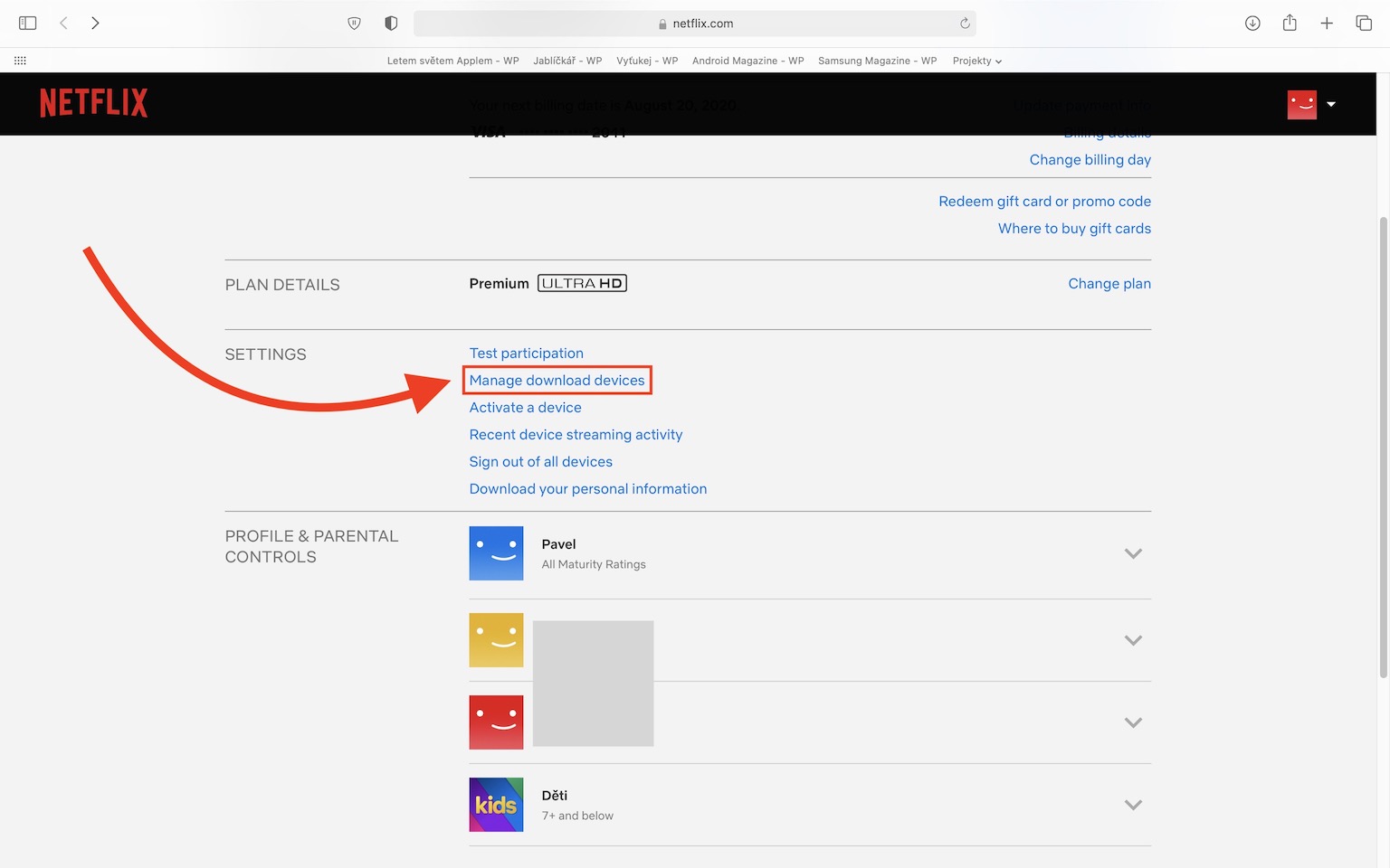 Pokud stahujete na všech zařízeních, která máte přihlášena k vašemu Netflix účtu, jistě jste si všimli, že je stahování povoleno pouze pro tolik zařízení, pro kolik je určen tarif (u Basic pro jedno, v tarifu Standard dvě a u Premium čtyři). Jestli jste ale nějaké z nich ztratili, zbytečně vám blokuje možnost stahování pro nové. Abyste z něj stažené položky vymazali, přejděte ve vašem prohlížeči do nastavení účtu, zde vyberte Manage download devices (spravovat stahování zařízení) a u zařízení, ze kterého chcete stažené položky odstranit, klikněte na Remove device (odebrat zařízení).
