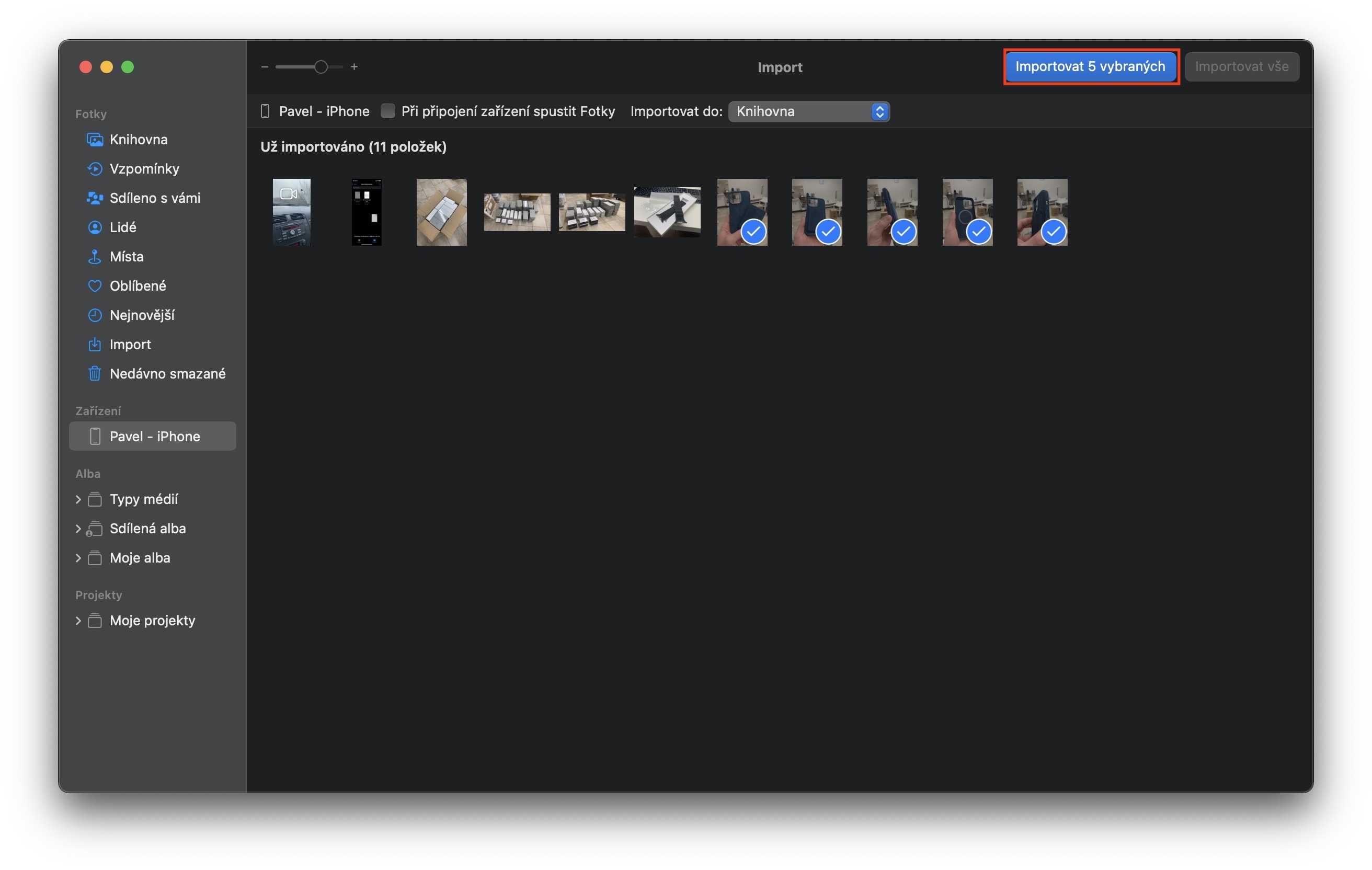 Zmíněný AirDrop je samozřejmě naprosto perfektní, pokud se ale ocitnete v situaci, kdy budete potřebovat přenést několik stovek či tisíc fotografií, tak uděláte lépe, když využijete starý dobrý kabel. Ne, že by AirDrop tento přenos nezvládl – osobně jsem skrze něj přesouvat několik desítek gigabajtů dat a vše proběhlo bez problémů. Jde spíše o rychlost celé akce, a také o spolehlivost a menší náchylnost na zrušení či selhání. Pro import fotek z iPhonu do Macu stačí, abyste pomocí Lightning kabelu váš iPhone připojili k Macu. Na tom pak spusťte aplikaci Fotky a v levém menu klepněte na název vašeho jablečného telefonu. V případě nutnosti samozřejmě připojení potvrďte zadáním hesla na iPhonu, a poté zvolte možnost pro důvěřování. Následně se vám zobrazí všechny fotky, které můžete importovat. Následně si označte fotky pro import a stiskněte Importovat vybrané, anebo zvolte možnost pro import všech fotek.