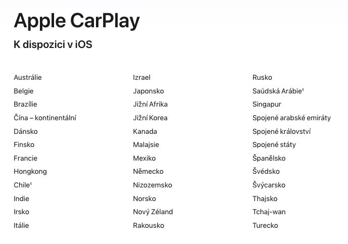 CarPlay je chytřejší a bezpečnější způsob, jak používat iPhone v autě tak, abyste se mohli lépe soustředit na silnici. Když je iPhone připojený ke CarPlay, můžete využívat navigaci, telefonovat, posílat a přijímat zprávy, poslouchat hudbu a dělat spoustu dalších věcí. Funkce sice víceméně bezproblémově funguje i u nás, avšak neoficiálně, protože Česká republika mezi podporovanými zeměmi nefiguruje.