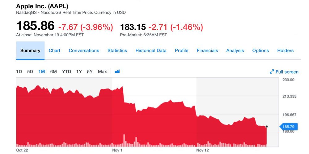 Co se týče přímo společnosti Apple, zde jsou hodnoty akcií jako na houpačce. Akcionáři se mohli radovat z nedávného maxima, na které akcie AAPL dosáhly 3. října, kdy hodnota jedné akcie překročila hranici 233 dolarů. Nyní, měsíc a půl po tomto maximu, je hodnota o více než 20 % níže, konkrétně na 177,4 dolarech. To znamená ztrátu zhruba 24 % z hodnoty jedné akcie a také celkový pokles hodnoty společnosti, která se nyní pohybuje kolem 842 miliard dolarů (bilionový obláček tak velmi rychle splaskl).