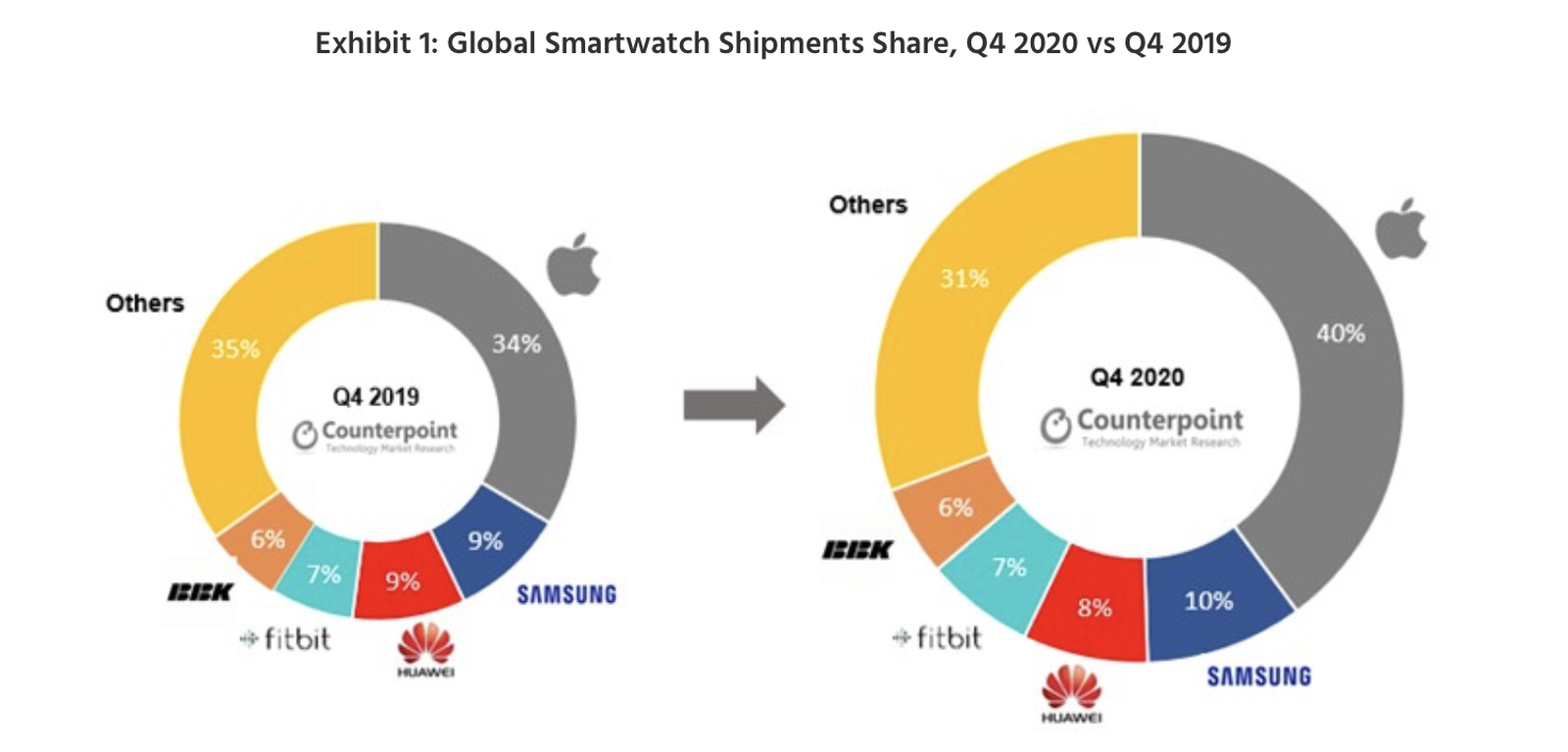 Cupertinská společnost dominovala již ve čtvrtém kvartále roku 2019, kdy ovládala zhruba 34 % trhu. Vloni se každopádně Apple světu pochlubil s dvěma novými modely, kterými jsou Apple Watch Series 6 a levnější model Apple Watch SE. Právě díky levnější variantě SE, jež jsou k dostání již od 7 990 korun. Dá se předpokládat, že právě tento model, ačkoliv nenabízí always-on displej, anebo EKG senzor, Applu nesmírně pomohl. Jeho tržní podíl totiž ze zmiňovaných 34 % vzrostl na skvělých 40 %. Analytik Sujeong Lim ze společnosti Counterpoint Research zastává názor, že levnější varianta jablečných hodinek pravděpodobně donutí giganty jako Samsung k vytvoření podobného produktu ve střední cenové skupině.