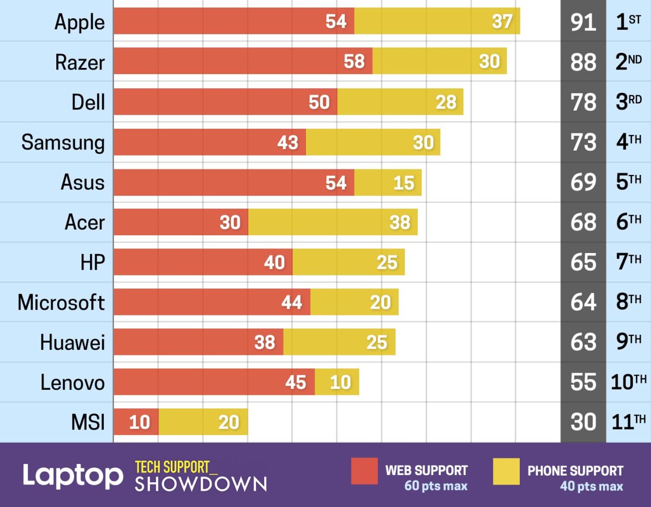 Třetí skončil Dell s odstupem 13 bodů a poté Samsung s odstupem 18 bodů. Microsoft se například umístil těsně nad Huawei s 64 body, což není příliš dobrý výsledek.