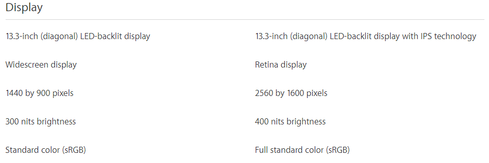 Pokud se podíváte do oficiálních specifikací MacBooku Air nyní, v záložce displeje nově svítí (sic!) hodnota 400 nitů. Tato změna je zatím dostupná jen na anglické mutaci webu apple.com. Český Apple.cz uvádí stále 300 nitů. Níže se můžete podívat na porovnání displejů mezi starým MacBookem Air a tím novým. Informace pochází z Apple.com