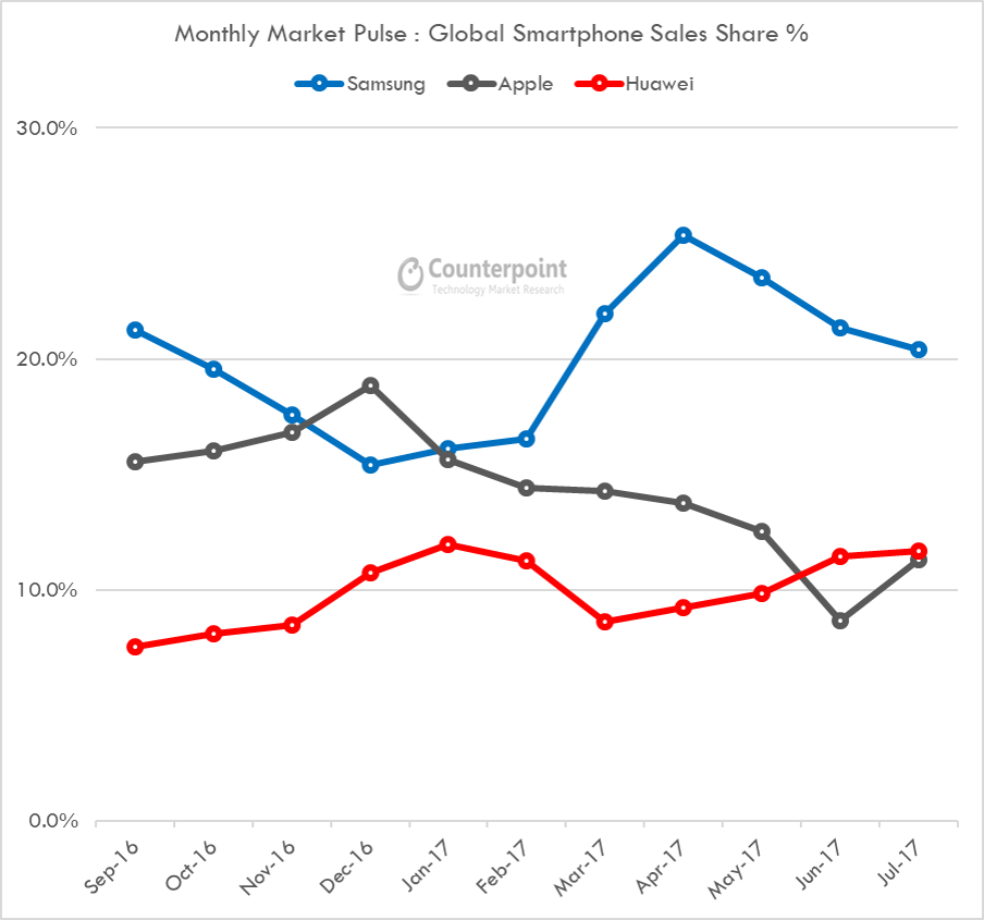 Tuto rošádu mezi druhým a třetím místem potvrzují data analytické společnosti Counterpoint, podle které Huawei prodalo více telefonů než Apple jak v červnu, tak v červenci. Srpnová data k dispozici ještě nejsou, dá se ovšem očekávat, že k výraznější změně nedojde, neboť se v posledním prázdninovém měsíci příliš mnoho věcí nezměnilo.