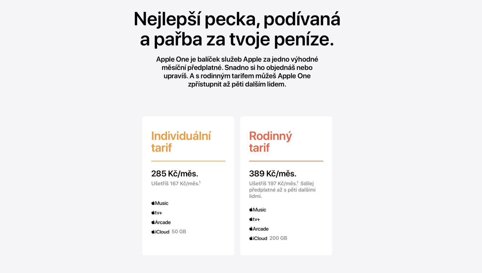 Jestliže vám informace o balíčku služeb Apple One utekly, tak se jedná o speciální výhodný balíček, díky kterému můžete ušetřit několik desítek korun. V České republice konkrétně můžete v rámci balíčku Apple One využít služby iCloud, Music, TV+ a Arcade, v zahraničí se pak ještě v předplatném nachází News, která však v tuzemsku k dispozici není. Momentálně si v Česku můžete vybrat ze dvou balíčků Apple One – první je individuální, tedy pouze pro jednu osobu, druhý je pak rodinný a nabízí perfektní řešení pro rodiny. Abychom byli přesnější, tak jednotlivec si může všechny čtyři výše zmíněné služby s iCloudem o velikosti 50 GB předplatit za 285 korun měsíčně, rodinné předplatné, ve kterém získáte 200 GB na iCloudu, pak vychází na 389 korun.