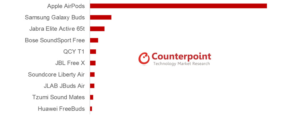 Ta dobrá zpráva je, že AirPods stále s přehledem ovládají celý trh bezdrátových sluchátek. Counterpoint sice nesděluje ve veřejně příslušné sekci čísla prodejů, ale dle konkrétních modelových řad jsou sluchátka Applu s velkým náskokem na prvním místě prodejů.