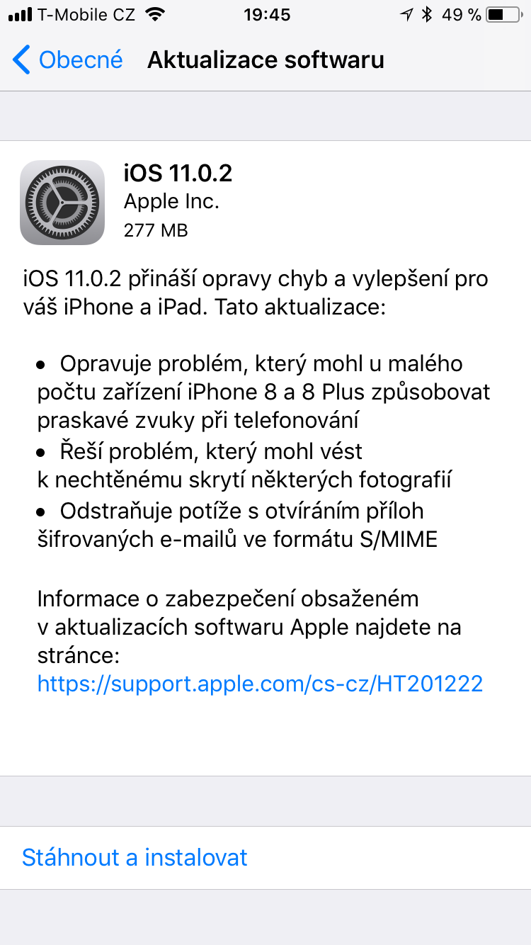Aktualizovat můžete klasickým způsobem Over-The-Air metodou a to přes Nastavení – Obecné – Aktualizace Softwaru. Nová verze iOS 11.0.2 má zhruba 277MB. iOS 11.0.2 přináší opravy chyb a vylepšení pro váš iPhone a iPad (a iPod Touch).