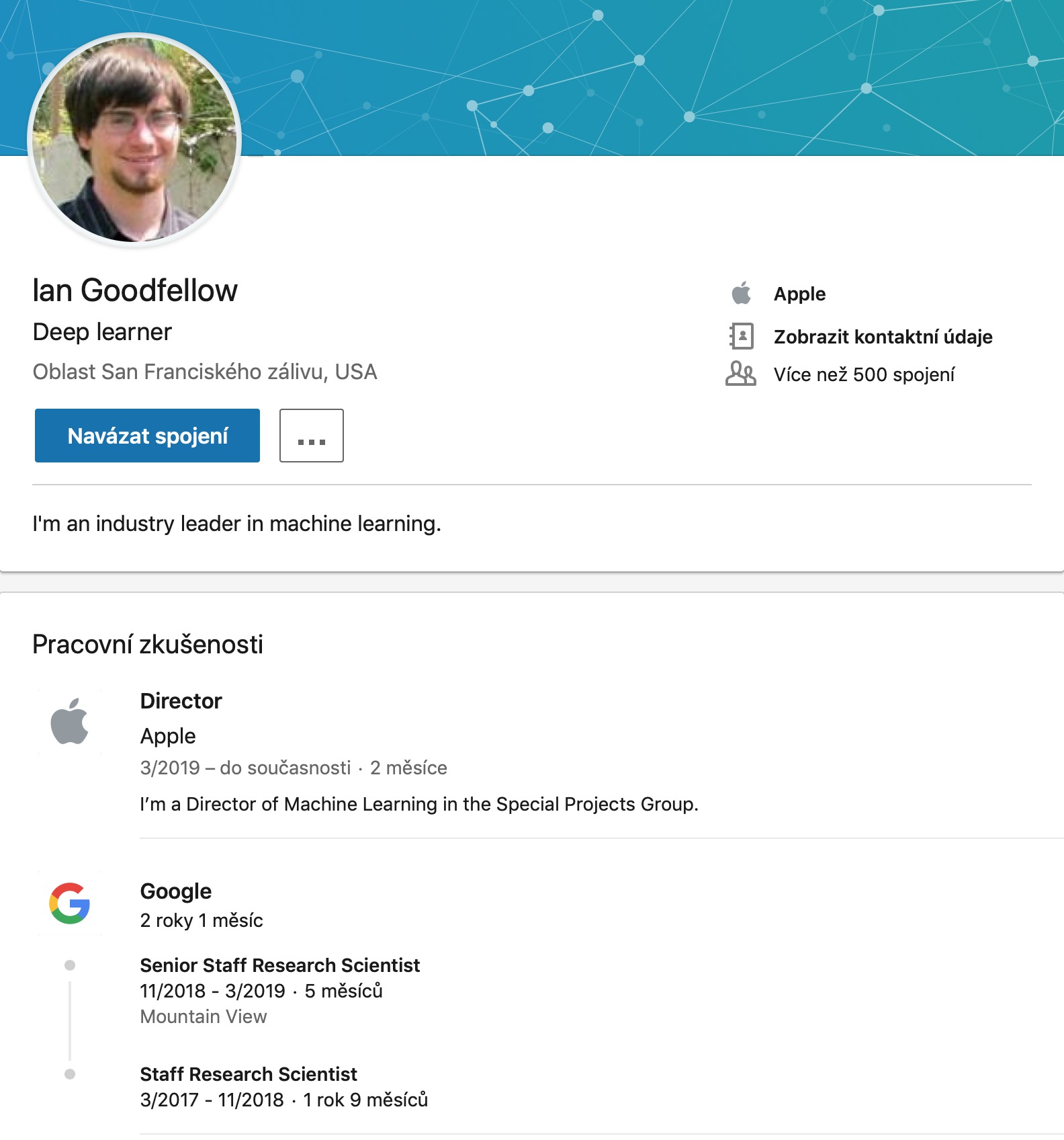 Apple nedávno obohatil řady svých zaměstnanců o posilu z Googlu. Ian Goodfellow se v Cupertinu připojí ke skupině, která má na starost speciální projekty. V Googlu se Goodfellow zabýval umělou inteligencí, stejný obor bude mít na starost také v Applu, kde ve zmíněné skupině zastane pozici ředitele pro strojové učení. Uvedl to nedávno na svém osobním profilu na profesní síti LinkedIn.