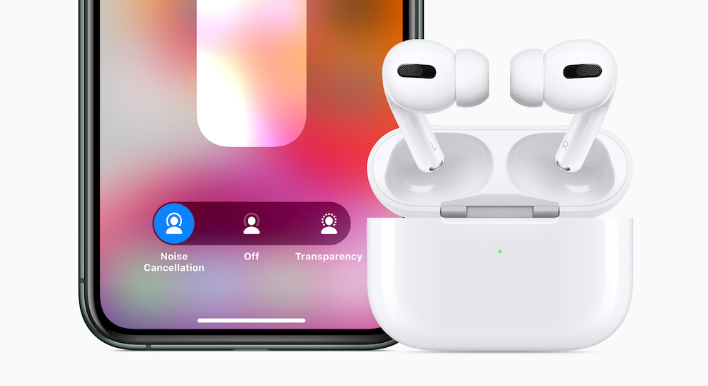 Hlavní novinkou AirPods Pro je bezesporu aktivní potlačení okolního hluku, které se neustále přizpůsobuje geometrii ucha a usazení špuntů, a to až 200krát za sekundu. Funkci mimo jiné zajišťuje dvojice mikrofonů, kdy první z nich snímá zvuky z okolí a blokuje je ještě dřív, než se vůbec dostanou k uším majitele. Druhý mikrofon pak detekuje a ruší zvuky jdoucí směrem od ucha. Spolu se silikonovými špunty je tak při poslechu zajištěn maximální izolační efekt.