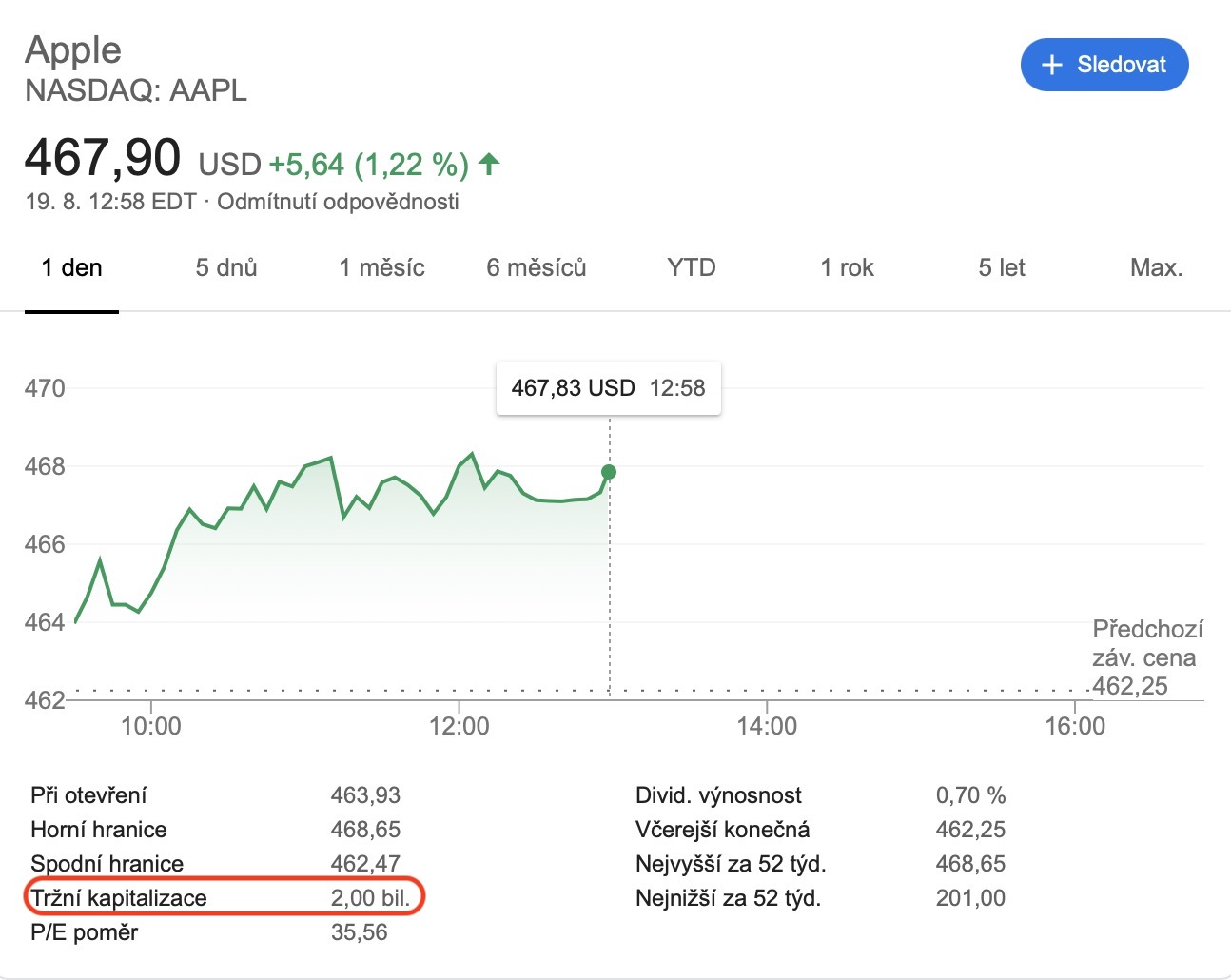 V posledních měsících můžeme vidět neustálý růst u hodnot jablečných akcií. Dnes se kalifornskému gigantu navíc podařilo překročit vcelku významný milník. Hodnota jedné akcie se dnes totiž dokázala na chvíli vyšplhat na 468,09 dolarů, tedy necelých 10 300 korun. Tento nárůst se samozřejmě projevil i na tržní hodnotě, která činí přes 2 biliony dolarů, což je po přepočtu asi 43,78 bilionu korun. Touto událostí se tak z Applu stává první společnost, jenž byla schopna zmiňovanou hranici překonat.