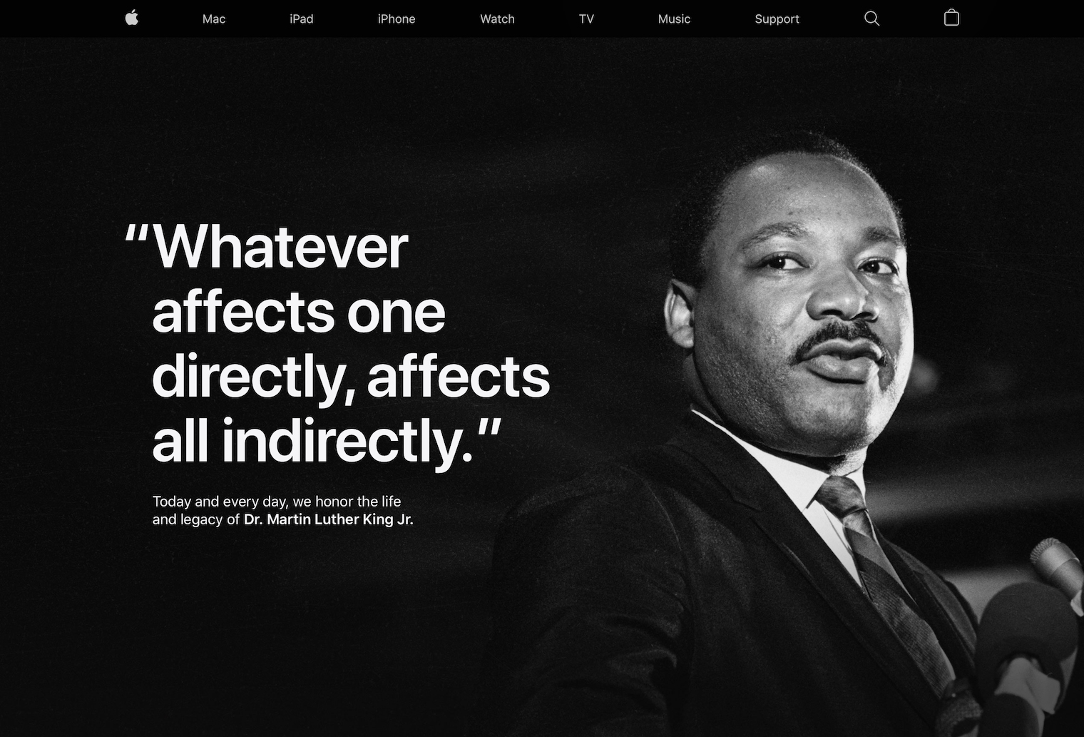Vedle fotografie MLK můžeme tento rok vidět inspirativní citát „Cokoliv, co přímo ovlivňuje jednoho, nepřímo ovlivňuje všechny ostatní.“ Pod citátem nyní Apple uvádí, že života a poselství, které MLK zanechal světu, si ctíme nejen dnes, ale každý den.