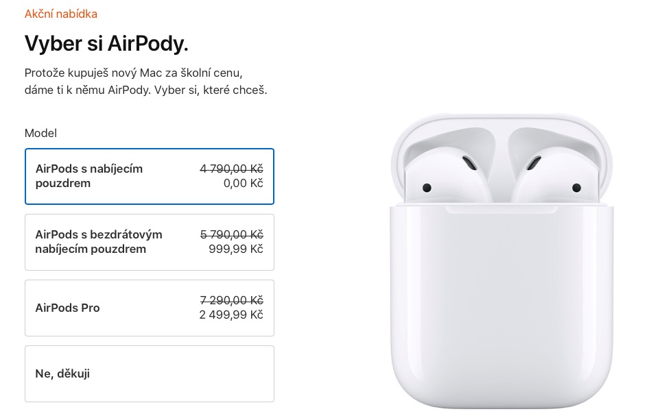 Kalifornský gigant se každé léto přihlásí se speciální akcí Zpátky do školy, která je určena pro studenty vysokých škol. Tato událost je již u Applu tradicí. Zatímco studenti mají přístup ke studentským slevám celoročně, tak v rámci této akce si vždy přijdou na nějaký ten bonus navíc. Letos se Apple rozhodl vsadit na sluchátka AirPods druhé generace v hodnotě 4 790 korun. A jak tedy sluchátka získat? Nejprve je samozřejmě nutné, abyste byli studentem vysoké školy. Následně vám už jen postačí, když si zakoupíte nový Mac nebo iPad, k čemuž vám kalifornský gigant automaticky přibalí i zmiňovaná sluchátka. V košíku navíc máte možnost si dokoupit bezdrátové nabíjecí pouzdro za dalších 999,99 korun, nebo rovnou sáhnout po verzi AirPods Pro s aktivním potlačením hluku, což vás vyjde na 2 499,99 korun.