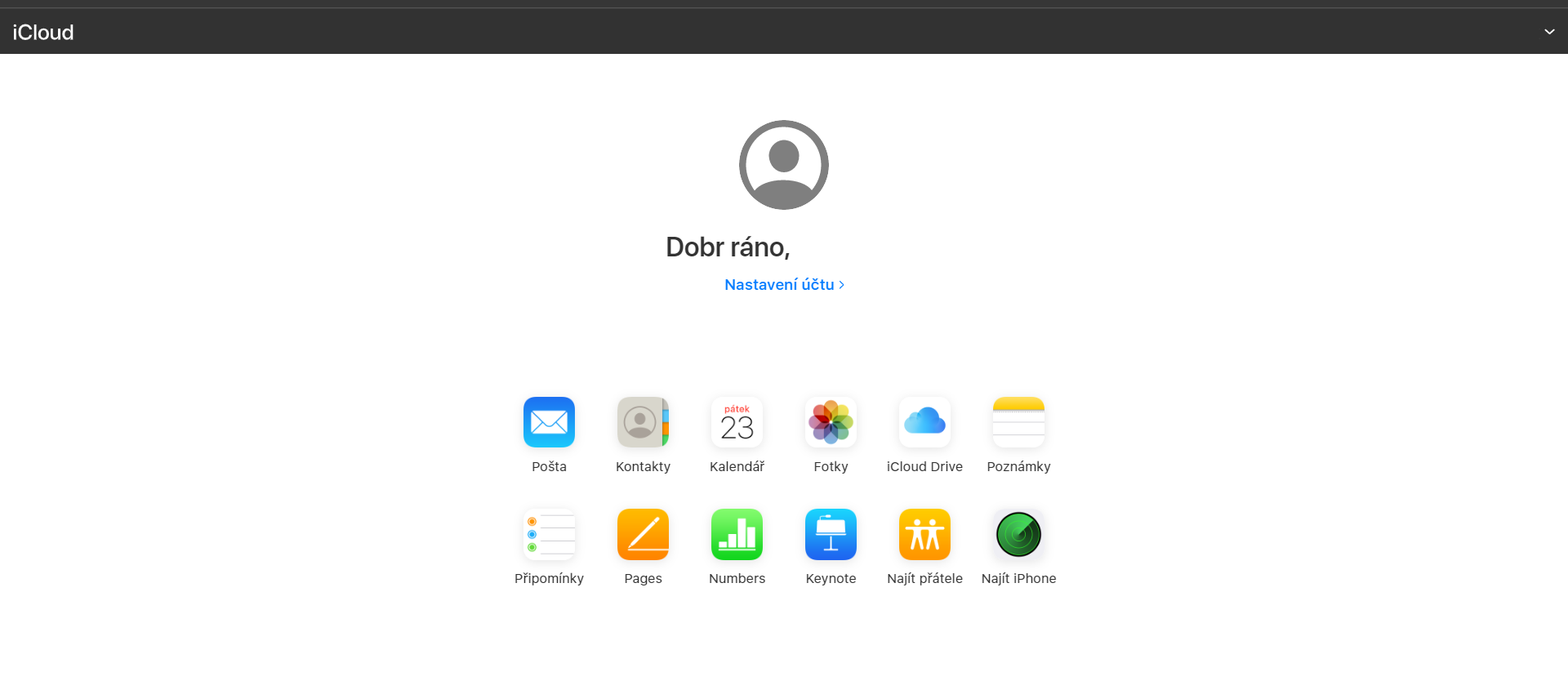 Nové webové rozhraní iCloudu má čistší design, na bílém pozadí najdeme zmenšené ikony, které se dočkaly drobných změn. Chybí ikonka Launchpad a Nastavení. To je nyní umístěno pod jménem a uvítacím textem. Ten v české mutaci ještě nefunguje tak, jak by měl, neboť má očividně problémy se zobrazováním některých českých znaků, viz fotografie níže.