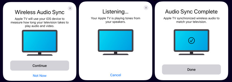 Pak stačí využít iPhone nebo iPad s iOS 13 (iPadOS) a postupovat dle pokynů na obrazovce. Apple TV se bude pokoušet synchronizovat zvuk na základě odezvy, kterou získá z mikrofonu daného zařízení. Naměřeno odezvu si pak ukládá do paměti a využije pro synchronizaci zvuku.