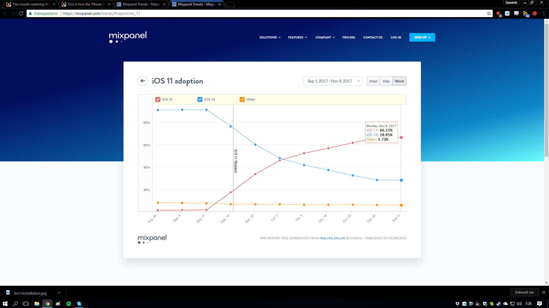 Veškeré předchozí zprávy o tom, jaký milník byl iOS 11 pokořen, byl postaven právě na informacích analytické společnosti Mixpanel, která se tomuto tématu věnuje několik let. Jak se můžete přesvědčit na jejich webu, v současné době by měla být nová verze iOS nainstalovaná na zhruba 66% zařízení. Tato hodnota se tedy od té oficiální liší o 14%.