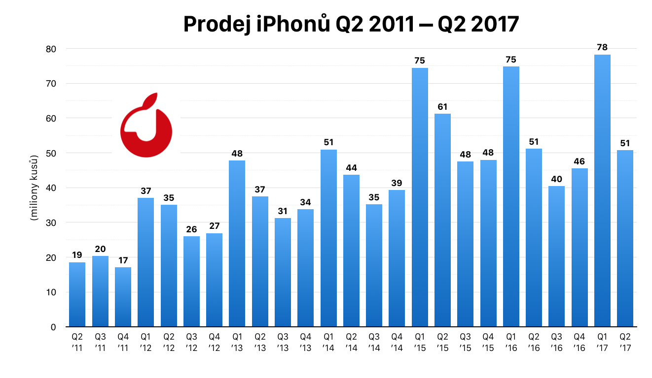 Apple oznámil, že ve druhém fiskálním čtvrtletí roku 2017 zaznamenal příjmy ve výši 52,9 miliardy dolarů, což znamená 4,5procentní meziroční růst. Zisk činil 11 miliard dolarů. Všichni byli zvědaví především na to, jak si povedou iPhony, těch se prodalo prakticky stejně jako před rokem, necelých 51 milionů.