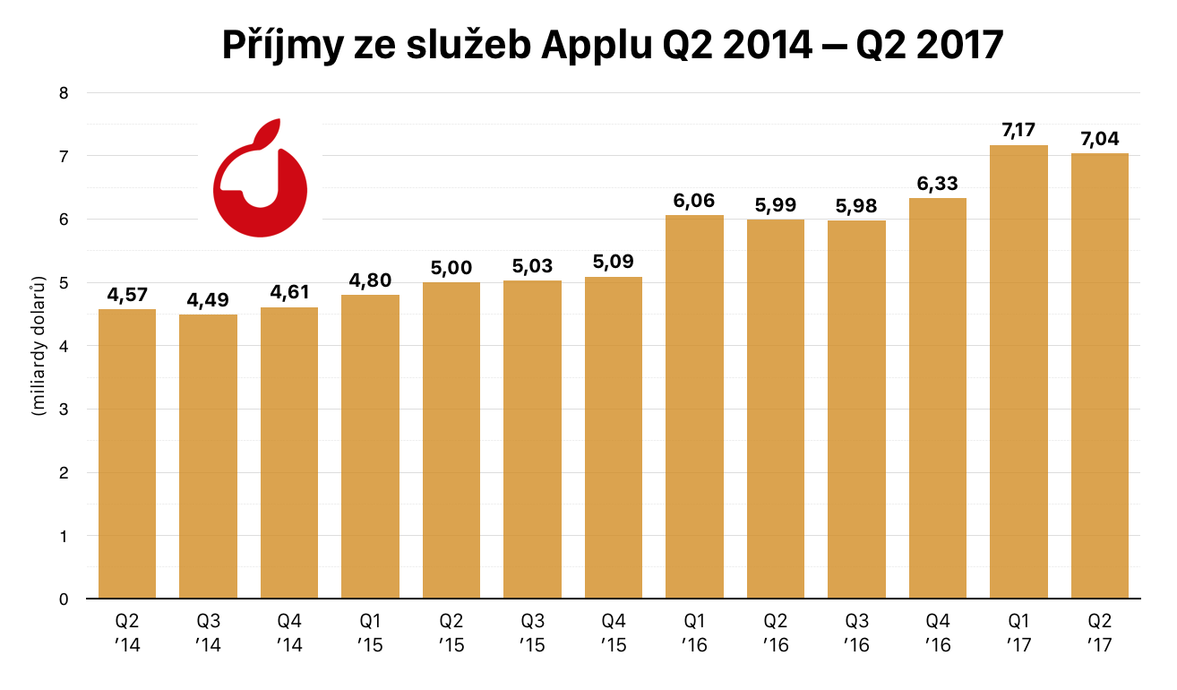 „Jsme nadšení ze silné pozice našich služeb, které mají největší příjmy za 13týdenní kvartál vůbec,“ připomněl Tim Cook, že předchozí čtvrtletí mělo o týden více, než je běžné. Služby přitom v Q2 2017 vygenerovaly jen o 130 milionů dolarů nižší příjmy než v Q1 (7,17 vs. 7,04 miliardy).