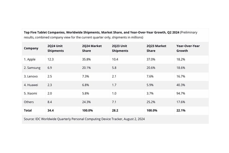 Trh vzrostl z 28,2 miliony prodaných kusů ve 2. čtvrtletí roku 2023 na 34,4 miliony prodaných kusů v období mezi dubnem a červnem letošního roku. Dařilo se všem v hlavní pětce. Apple ale drží krásný 35,8% podíl z celosvětového koláče. Loni to bylo 37 %. Čtvrtletní dodávky iPadů dokázaly vyskočit z 10,4 na 12,3 milionů a není třeba hádat, co za to může. Loni Apple totiž nepředstavil jediný nový iPad, letos boduje s novinkami v řadách Air a Pro.