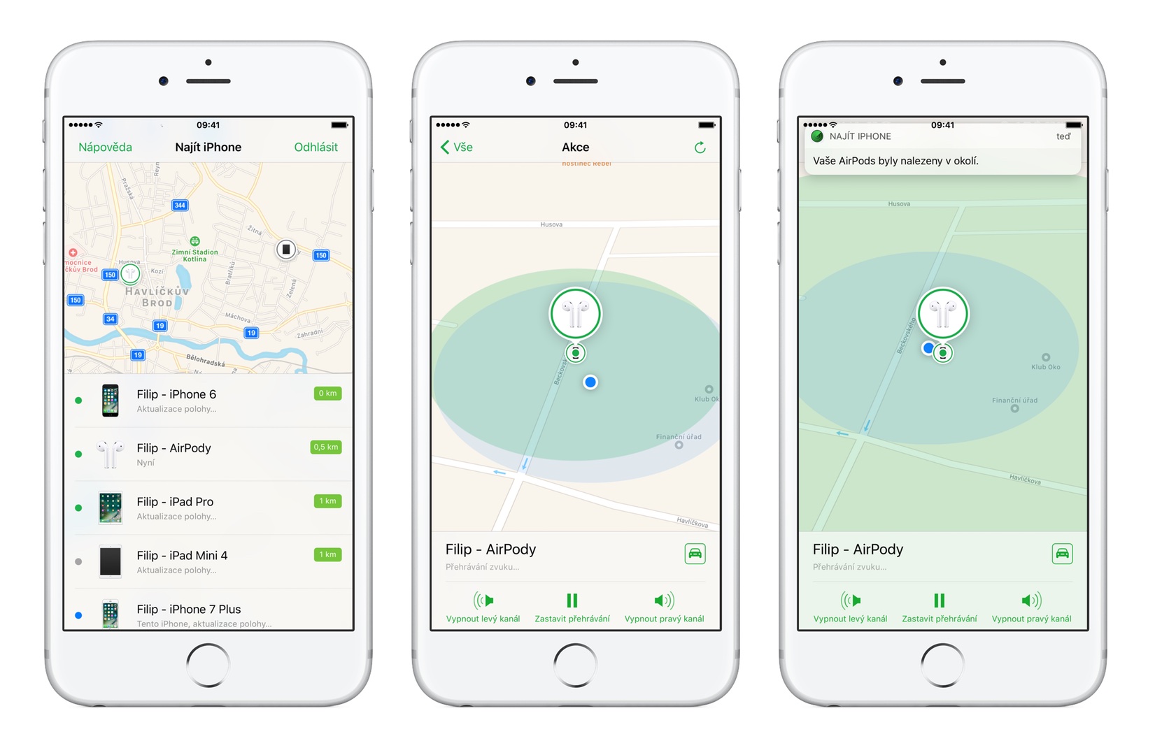 Majitelé AirPodů získávájí v iOS 10.3 šikovnou možnost vyhledat svá sluchátka pomocí služby Najít iPhone, která zobrazí aktuální nebo poslední známou polohu AirPodů. Pokud sluchátka nebudete moci najít, můžete se je i tzv. „prozvonit“.