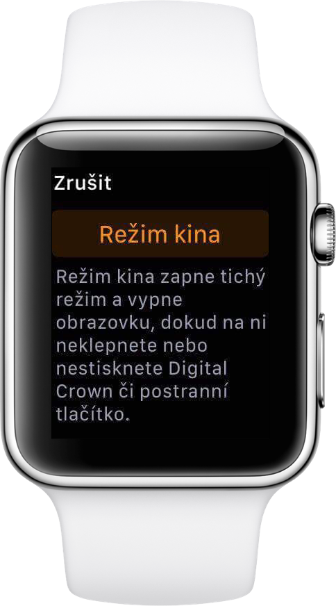 Režim kina právě toto – rozsvícení displeje po otočení zápěstí – vypíná a zároveň Watch zcela ztiší. Máte tak jistotu, že v kině nikoho, ani sebe, nevyrušíte. Při obdržení notifikace vám nicméně hodinky zavibrují a kliknutím na digitální korunku si ji můžete v případě potřeby nechat zobrazit. Režim kina aktivujete vysunutím panelu zespodu obrazovky.