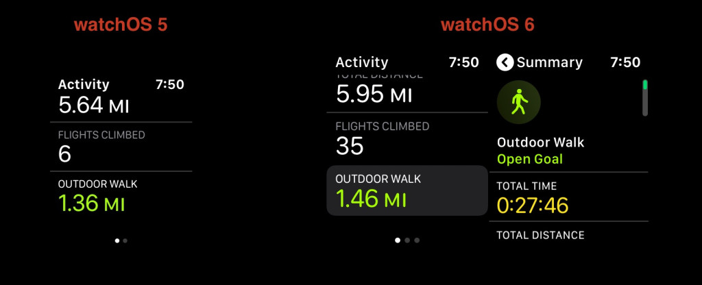 Ve watchOS 6 bude tato část uživatelského rozhraní přepracována. Tam, kde je dnes možné na Apple Watch zobrazit jednoduchý seznam uplynulých aktivit, bude nově možné každý záznam rozkliknout a zobrazit detailní informace o cvičení. To vše bez nutnosti mít u sebe mateřský iPhone.