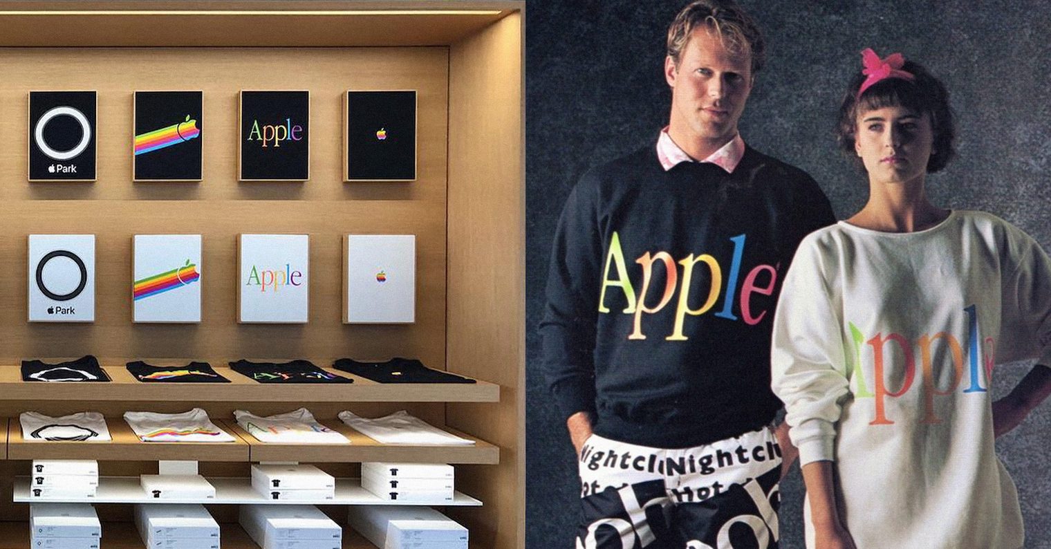 Pokud máte jablečný merch zmapovaný důkladněji, jistě vás napadne, že letošní design vlastně není úplně žhavou novinkou. Silně totiž připomíná Apple kolekce z osmdesátých let minulého století. Na fotografiích v galerii k tomuto článku si můžete všimnout například nápisu „Hello“, známého z počítače Macintosh z roku 1984, a vyvedeného v charakteristických duhových barvách. Duhový je i kruh, symbolizující Apple Park, natištěný na látkových taškách – podobné tašky z osmdesátých let jsou ozdobené duhovým logem nakousnutého jablíčka. Jako věrné kopie osmdesátkových modelů zase působí trička s letícím barevným logem Apple.