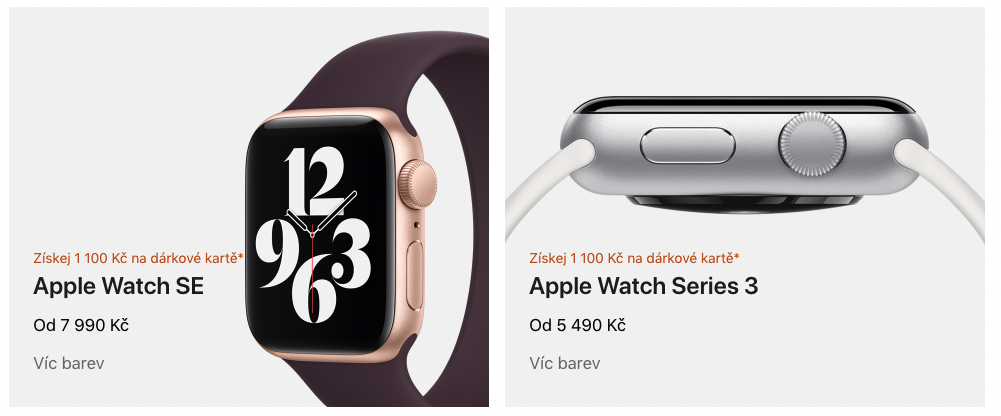 1 100 Kč na dárkovou kartu nemusí úplně dávat smysl u Apple Watch SE, jejichž cena začíná na 7 990 Kč. V případě nenáročného uživatele, který však přemýšlí o Apple Watch Series 3, které začínají na ceně 5 490 Kč, už může být situace jiná. Bonus na dárkovou katu pak můžete snadno uplatnit třeba na další originální řemínek.
