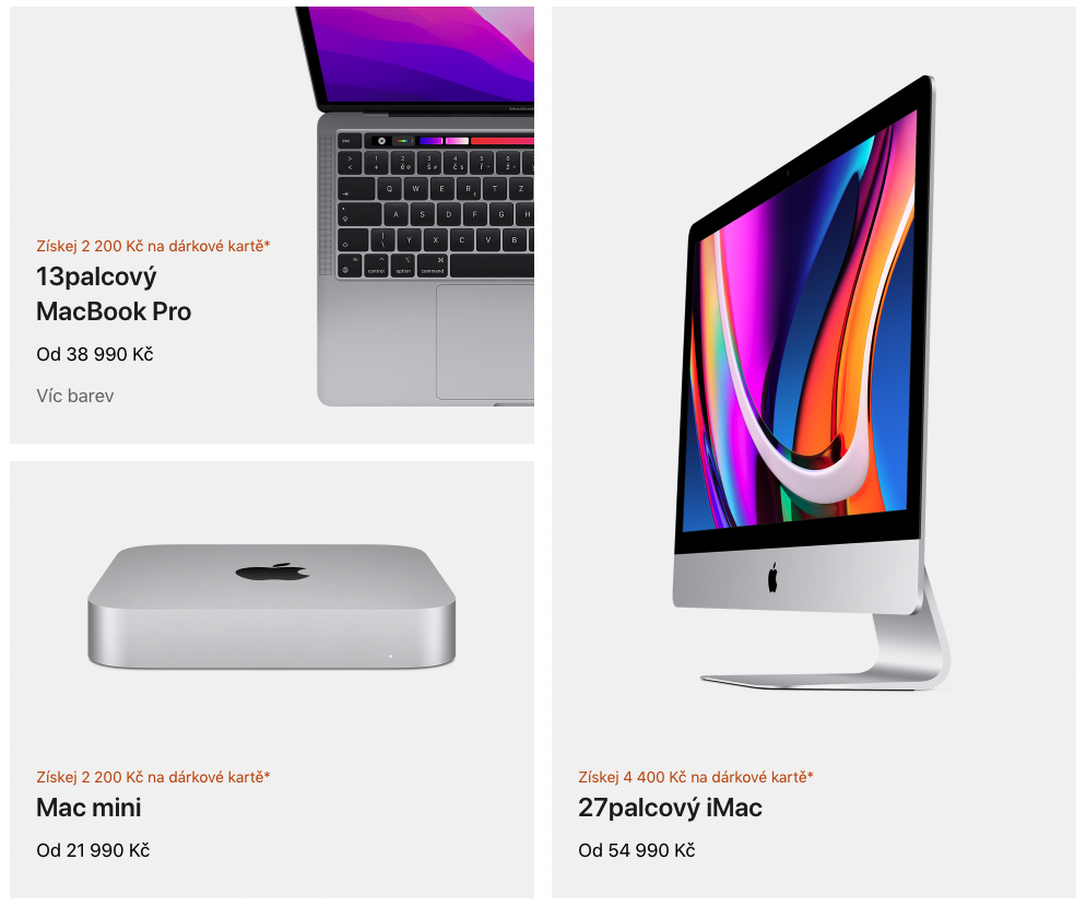 Částka 2 200 Kč za 13“ MacBook Pro, který startuje na 38 990 Kč, není nikterak vysoká a spíše jen symbolická. Tuto částku dostanete i v případě koupě Macu mini, který stojí 21 990 Kč, nebo MacBooku Air, který začíná na 29 990 Kč. Nejvyšší „slevu“ v celé akci nabízí společnost u 27palcového iMacu. Ten startuje na částce 54 990 Kč a sleva na dárkovou kartu v tomto případě činí 4 400 Kč.