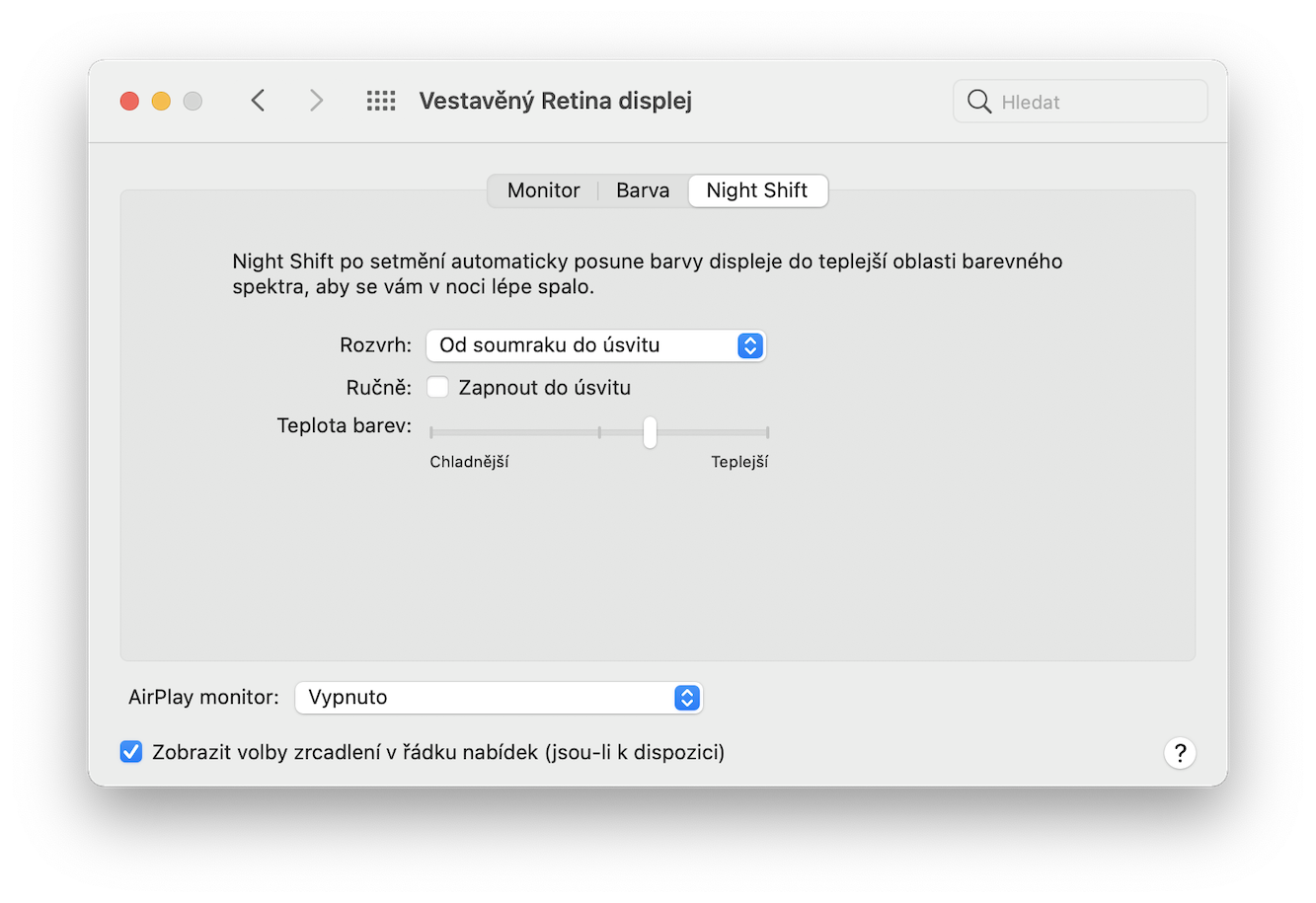 Stejně jako režim Nerušit, tak i funkci Night Shift můžete znát z iPhonu či iPadu. Displeje totiž trpí jedním nepříjemným neduhem, kterým je vyzařování modrého světla. To se může negativně podepsat na kvalitě vašeho spánku, protože tak dochází k úbytku tvorby melatoninu neboli hormonu spánku. Naštěstí i na tohle při tvorbě systému macOS mysleli, a proto implementovali funkci Night Shift. Ta dokáže zmiňované modré světlo částečně zredukovat a přenést barvy do teplejšího spektra. Vše si můžete sami nastavit v Předvolbách, konkrétně tedy v záložce Monitory, kde se stačí nahoře překliknout na Night Shift.