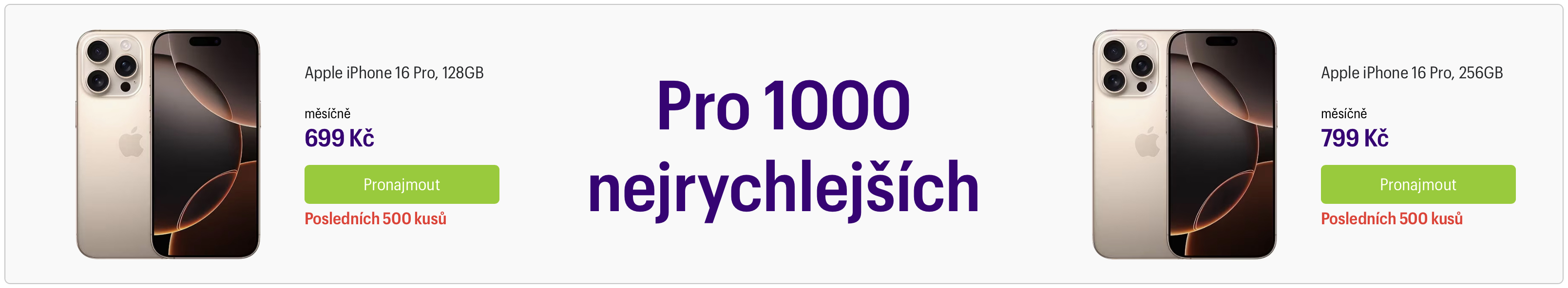 Takto nízkou cenu může Mobil Pohotovosti v rámci své nové služby nabídnout hlavně díky svým dlouholetým zkušenostem s prodejem použitých telefonů, kde si drží výsadní postavení. iPhone 16 Pro za pouhých 699 Kč měsíčně je ovšem nabídka pro ty nejrychlejší – akční cena platí pro prvních 1 000 zákazníků, kteří si telefon v rámci služby pořídí.