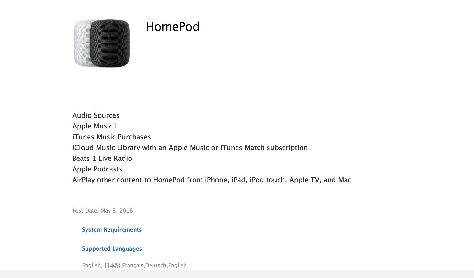 Před víkendem se na oficiálním webu Applu objevila zvláštní technická dokumentace k HomePodu, ve které je rozebráno několik způsobů, jakým je skrze HomePod možné přehrávat hudbu. To by nebylo samo o sobě tak zajímavé, kdyby se ve spodní části dokumentu nenacházela informace (napsaná velice malým písmem), že HomePod podporuje – kromě angličtiny, ještě francouzštinu, němčinu a japonštinu. To v současné době rozhodně neplatí, neboť je HomePod momentálně dostupný jen v anglicky mluvících zemích.